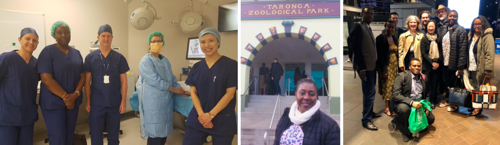 from left to right: African fellows with Drs Simon Skalicky, Ridia Kim, Geoff Cohn, Anne Brooks and Mitchell Lawlor after the Sydney mini-symposium, Dr Jagun at the Toronga Zoological Park and Dr Jagun with Drs Anthony Clark, Prof Bill Morgan, Nurse Christine Darragh and Dr Jessica Ong at the Lions Eye Institute Theatre, Nedlands